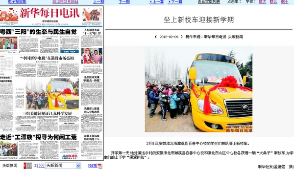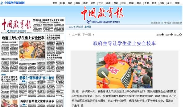 近日来,《中国教育报》、《安徽日报》、《新安晚报》、《淮北日报》、《淮北晨刊》、《淮北新闻联播》、《直播淮北》、《淮北广播电视报》、新华网、人民网、新华每日电讯、中国网、中国公益网、中工网、网易、中国广播网、中国教育新闻网、搜狐网、新华网安徽频道、新安传媒网等国内数十家主流平面媒体、电视媒体和网络媒体,在其头版或显著位置刊登、转载了安徽龙波电气向淮北农村学校捐赠校车的善举。 在此,安徽龙波电气感谢社会各界和媒体朋友的关注与支持,让我们一起加入到公益事业的行列当中,共同携手,为孩子们创造美好的明天!