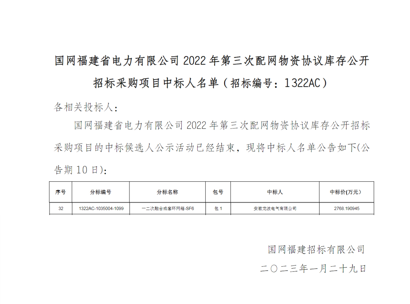 1月29日,国网福建省电力有限公司2022年第三次配网物资协议库存公开招标采购的中标活动已经结束,我司成功中标一二次融合成套环网箱,中标金额2768万元。成绩是前进途中的里程碑,今日的成功是昨日的汗水灌溉所结出的硕果。而今后我们需要加倍的努力,以适应瞬息万变的市场,以实现远大的目标;脚下的道路,任重而道远。