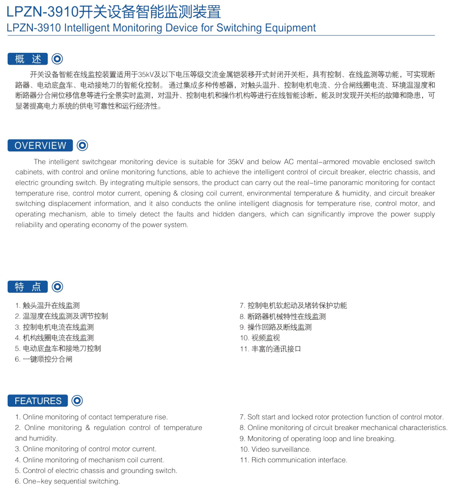 开关设备智能在线监控装置适用于 35KV 及以下电压等级交流金属铠装移开式封闭开关柜,具有控制、在线监测等功能,可实现断路器、电动底盘车、电动接地刀的智能化控制。 通过集成多种传感器,对触头温升、控制电机电流、分合闸线圈电流、环境温湿度和断路器分合闸位移信息等进行全景实时监测,对温升、控制电机和操作机构等进行在线智能诊断,能及时发现开关柜的故障和隐患,可显著提高电力系统的供电可靠性和运行经济性。